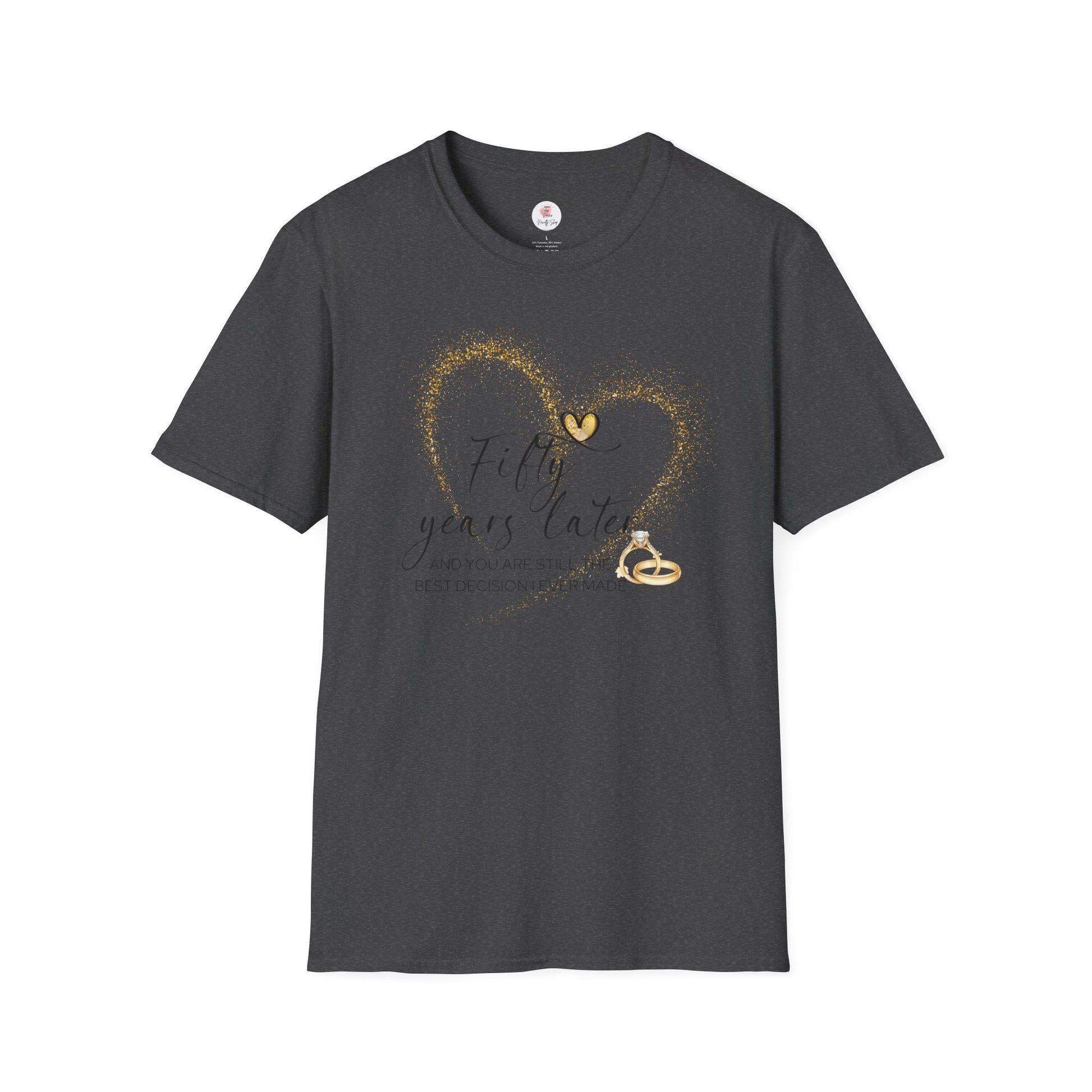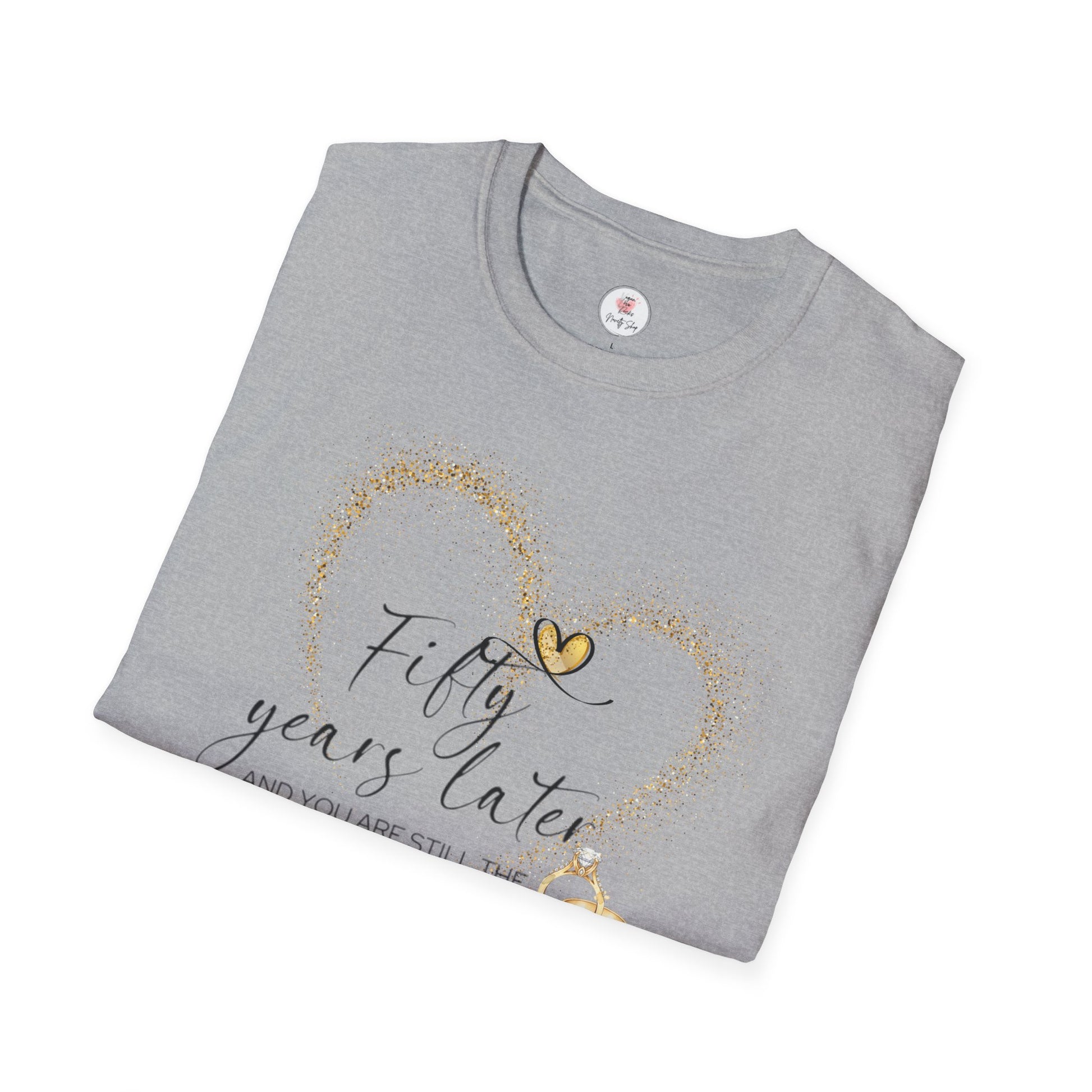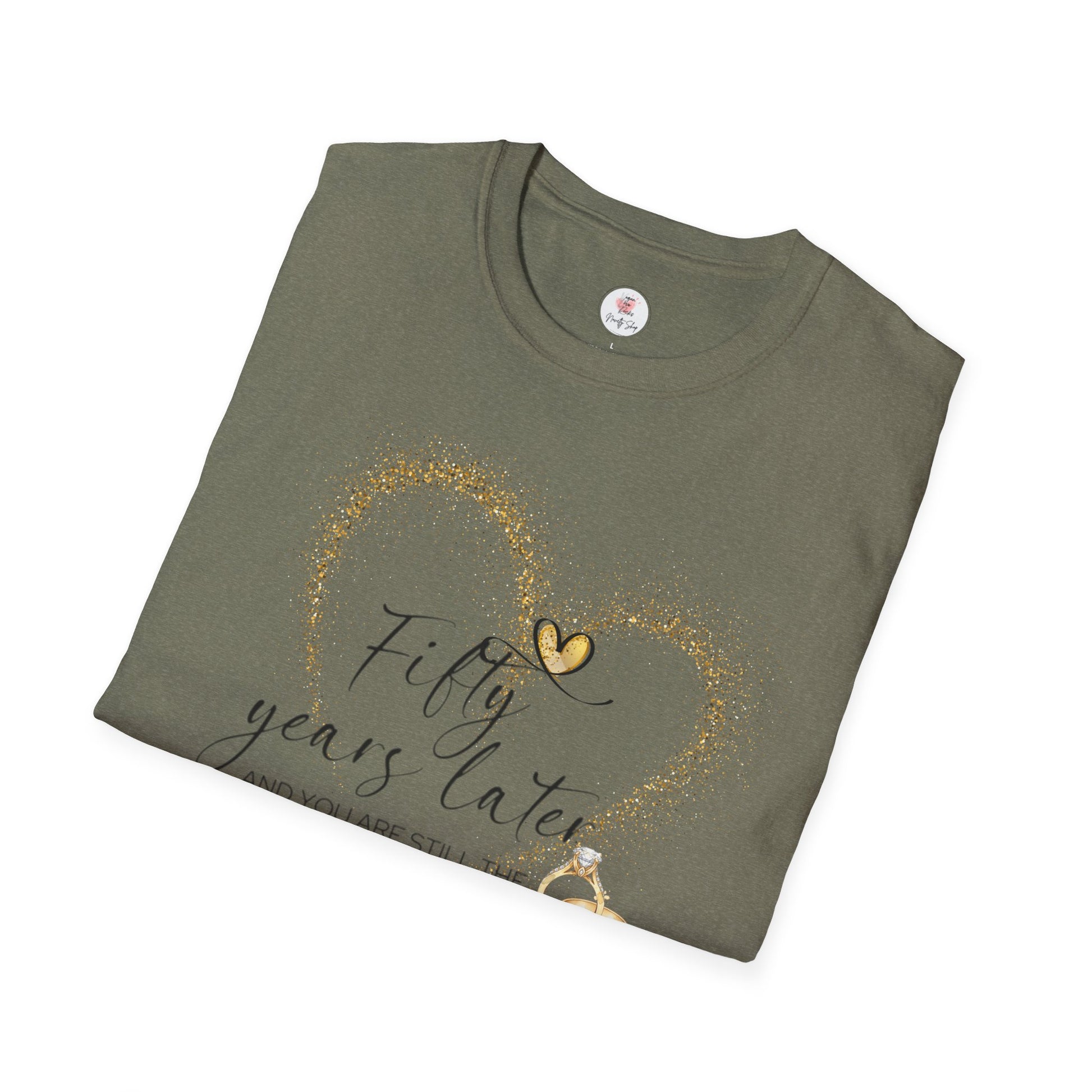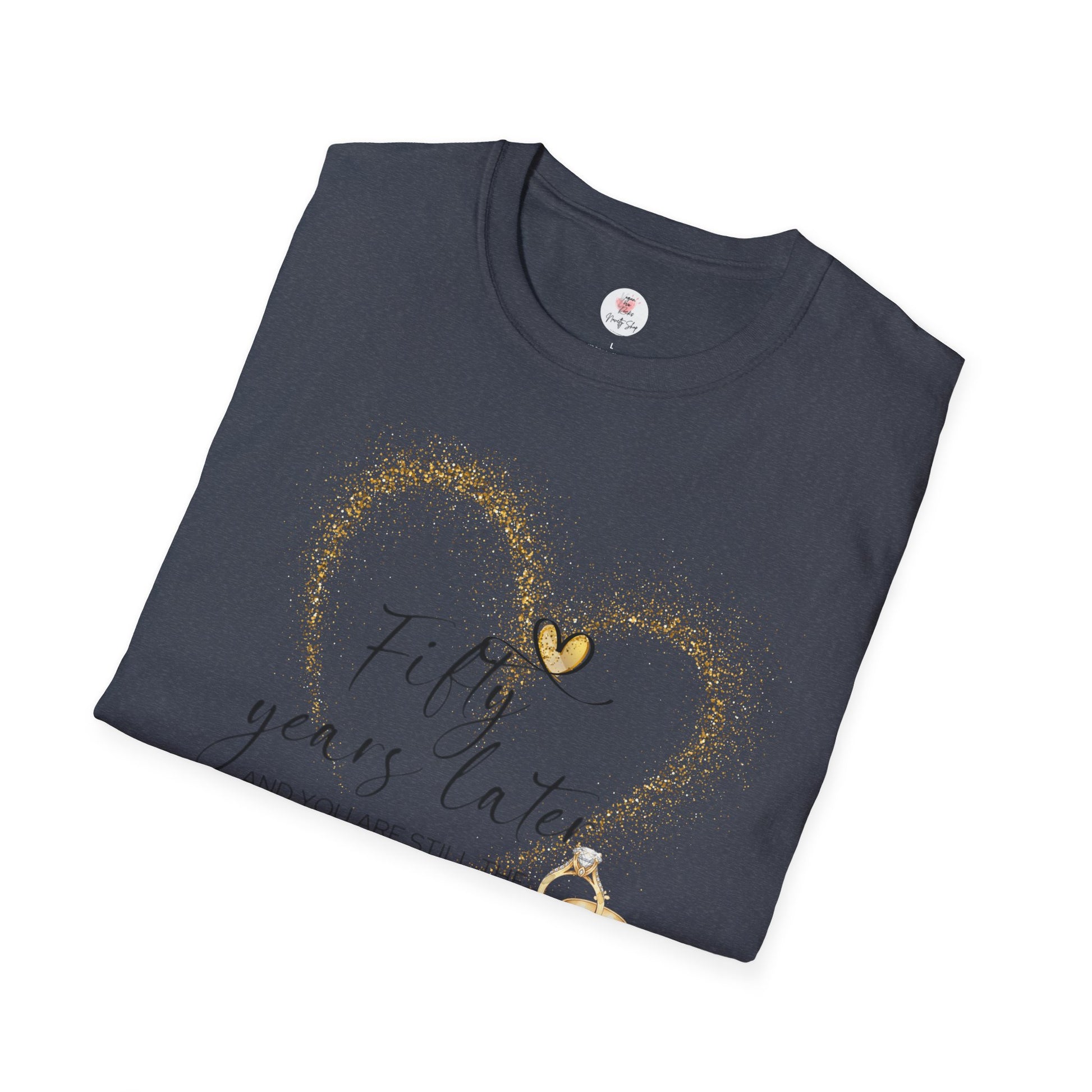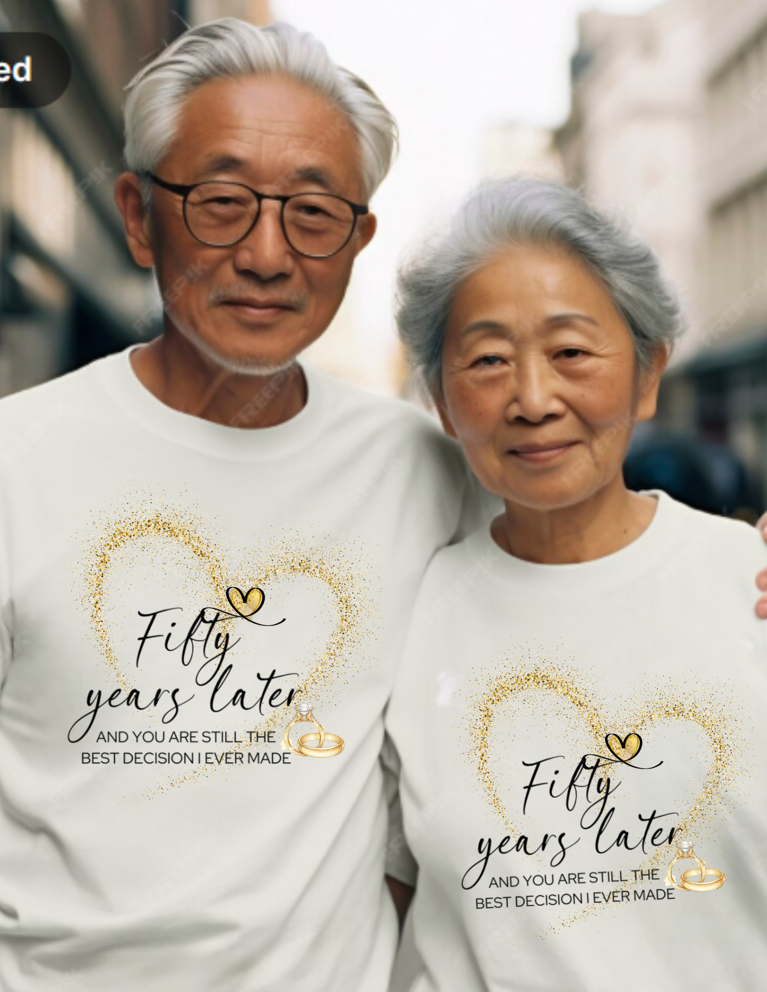 Celebrate a golden milestone with a soft, wearable memory. This lightweight tee carries a gentle, handwritten design of two intertwined hearts and subtle gold accents—an understated nod to fifty years together. Wear it at intimate anniversary gatherings, family dinners, or during quiet mornings reminiscing over old photographs. It’s for those who prefer quiet elegance and comfort while honoring a lifetime of shared small moments.