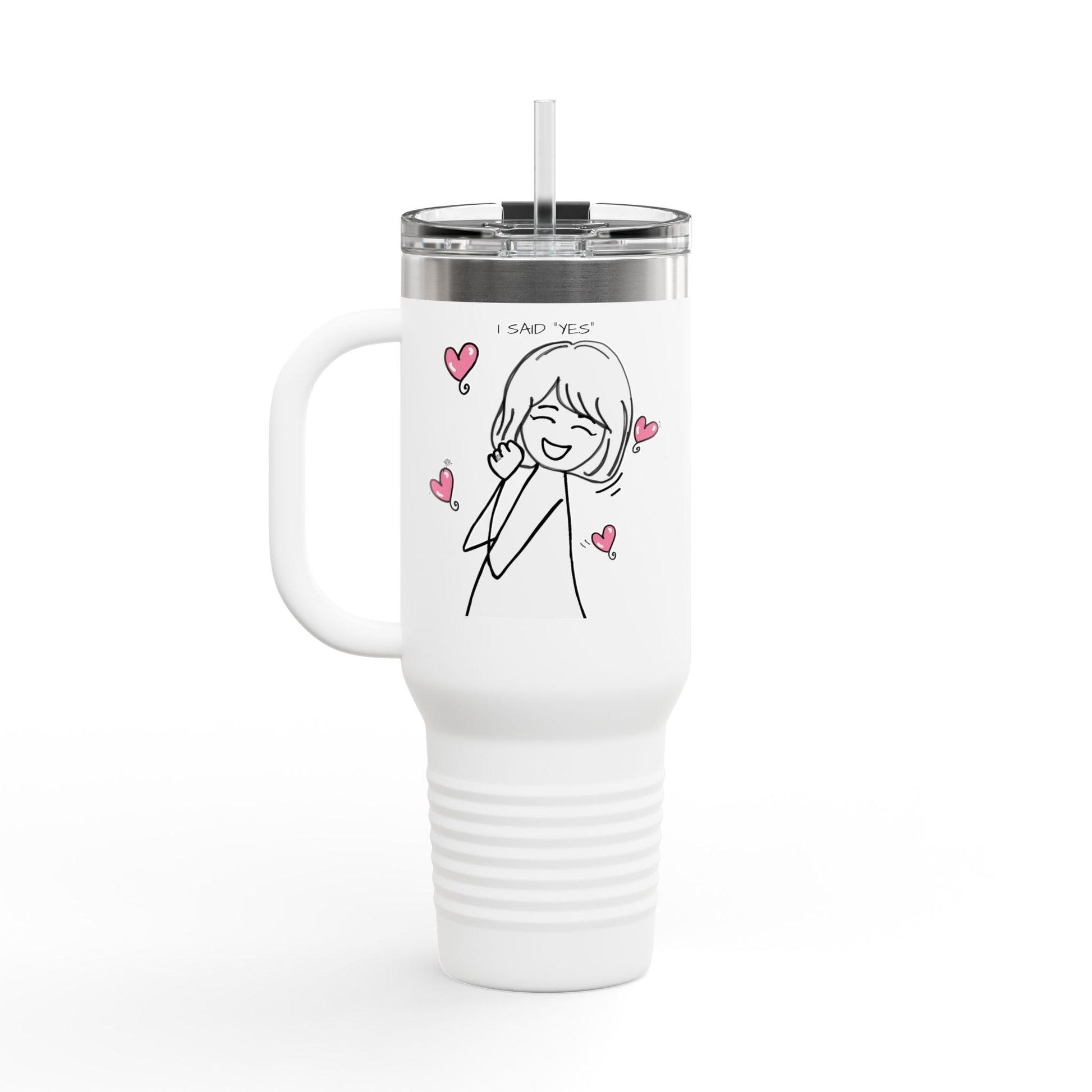 Cute Girl Illustration with Pink Hearts -“I Said Yes” 40-oz Insulated Travel Mug