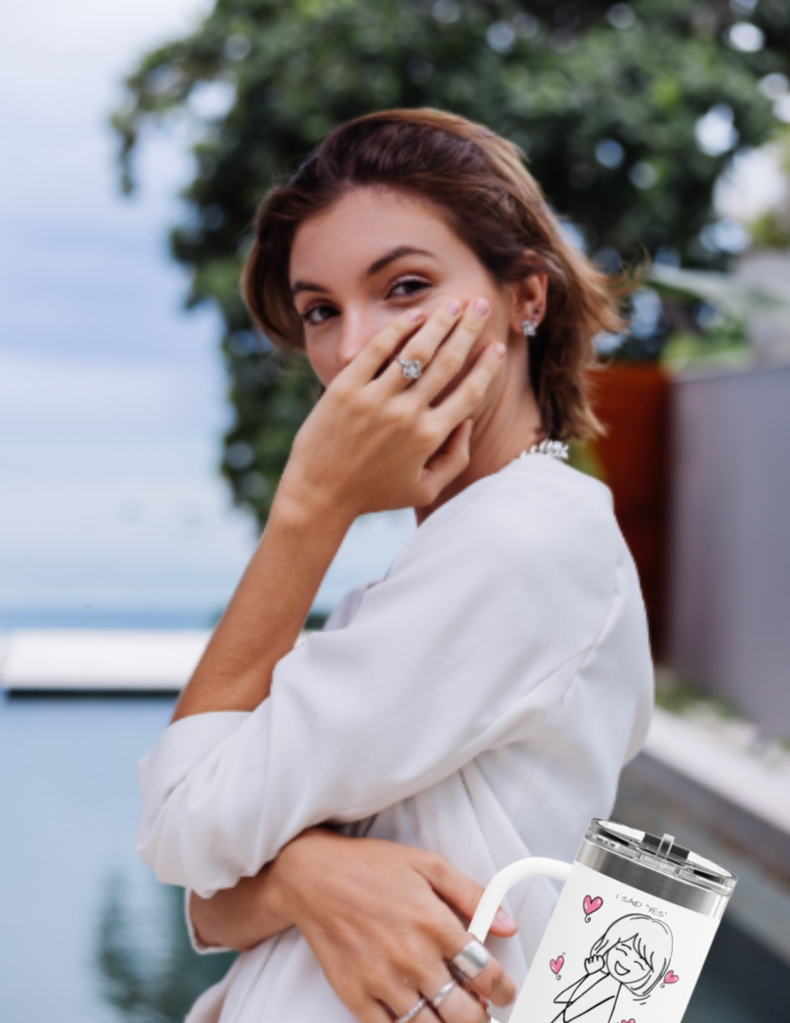 She's the happiest girl in the world, and she's engaged! Clean, powder-coated white wraps a hand-drawn illustration of a smiling figure surrounded by tiny pink hearts, showcasing the most significant moment of her life, when she said "YES". The tall, ergonomic silhouette with a comfortable handle and included straw makes sipping easy, whether you’re driving, hiking, or settling in at your desk. Durable stainless steel construction, double-wall insulation, and a leak-resistant lid mean fewer stops and less reheating. This playful artwork adds a personal touch and makes a great gift for that someone special to remember the big day!