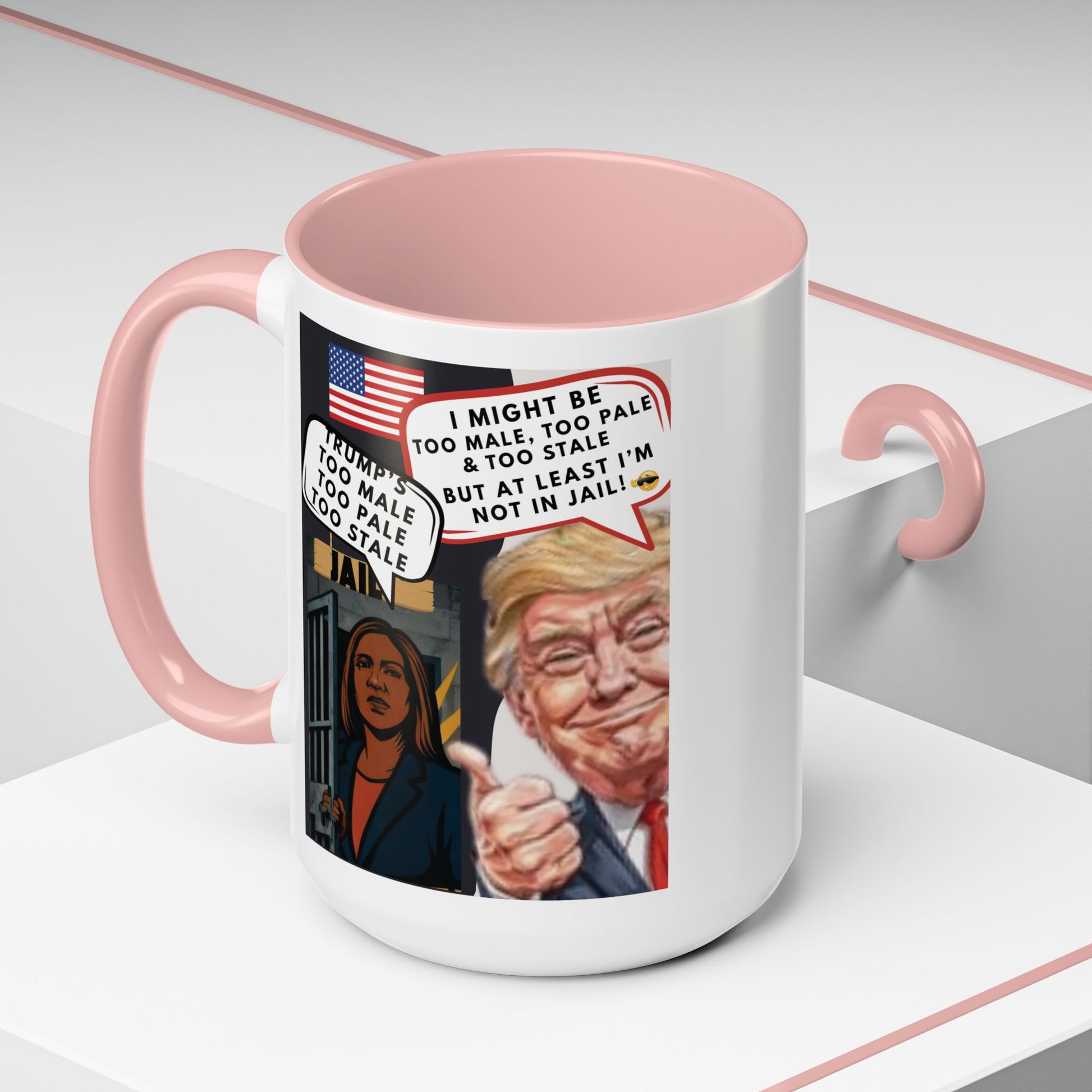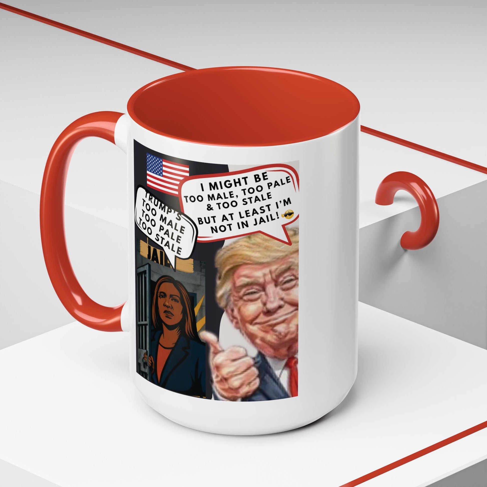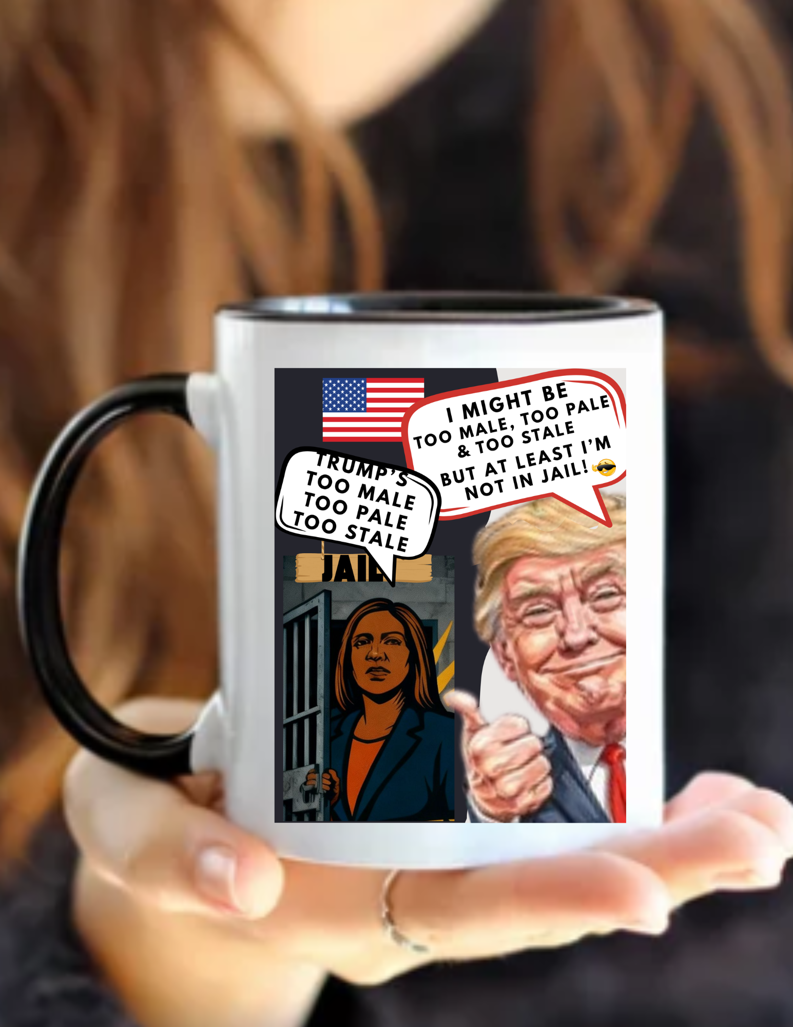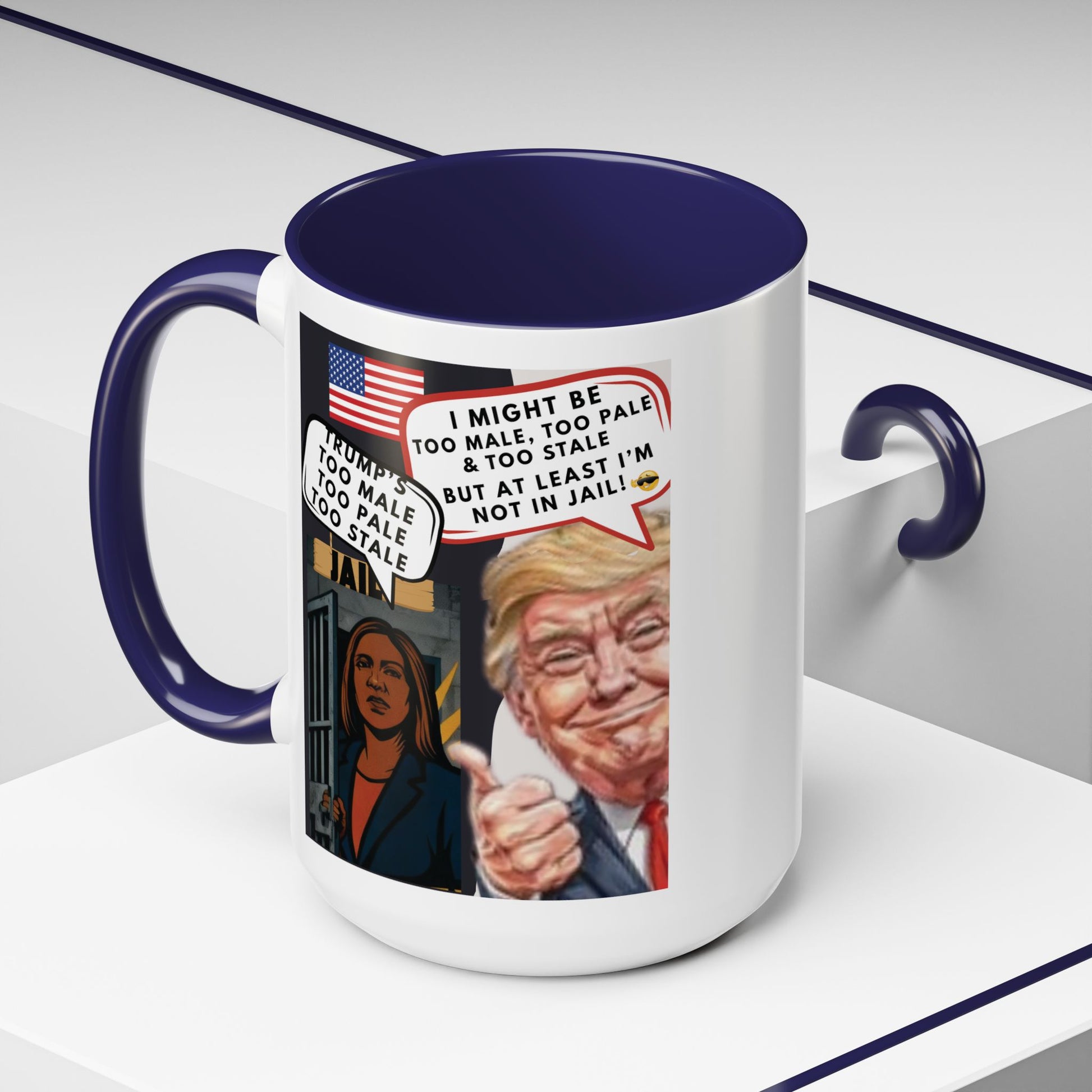 This vibrant Mug featuring the humorous quote 'I Might Be Too Male, Too Pale, Too Stale, But At Least I'm Not In Jail, Trump' is perfect for those with a witty sense of humor. It's a great addition to your morning coffee routine or as a conversation starter at the office. Ideal for those who appreciate political humor and sarcasm, this mug is a fun way to express your opinions in a lighthearted manner. Perfect for gifting on birthdays, holidays, or special occasions.